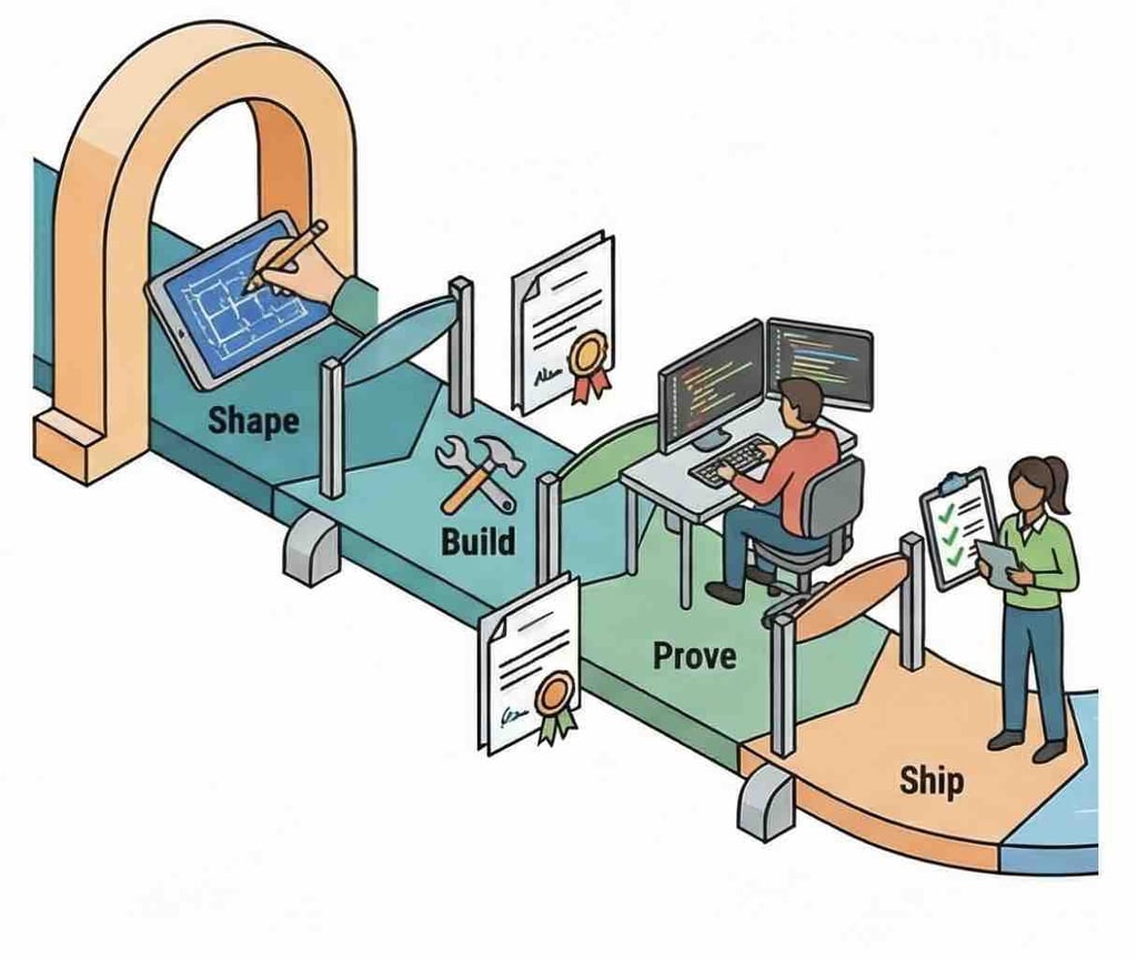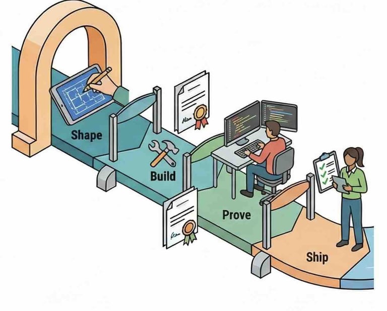 Prove → Ship: test results, logs from trial deployments, confirmed rollback plan and monitoring.
